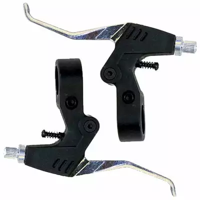 Fabriqués en aluminium et en plastique, ces poignées de frein de vélo sont conçues pour être actionnées par deux ou trois doigts de la main. La tension du ressort qui fait revenir la poignée à sa position originale est réglable par vis. La tension du câble de frein peut être ajustée à l’aide d’un écrou.